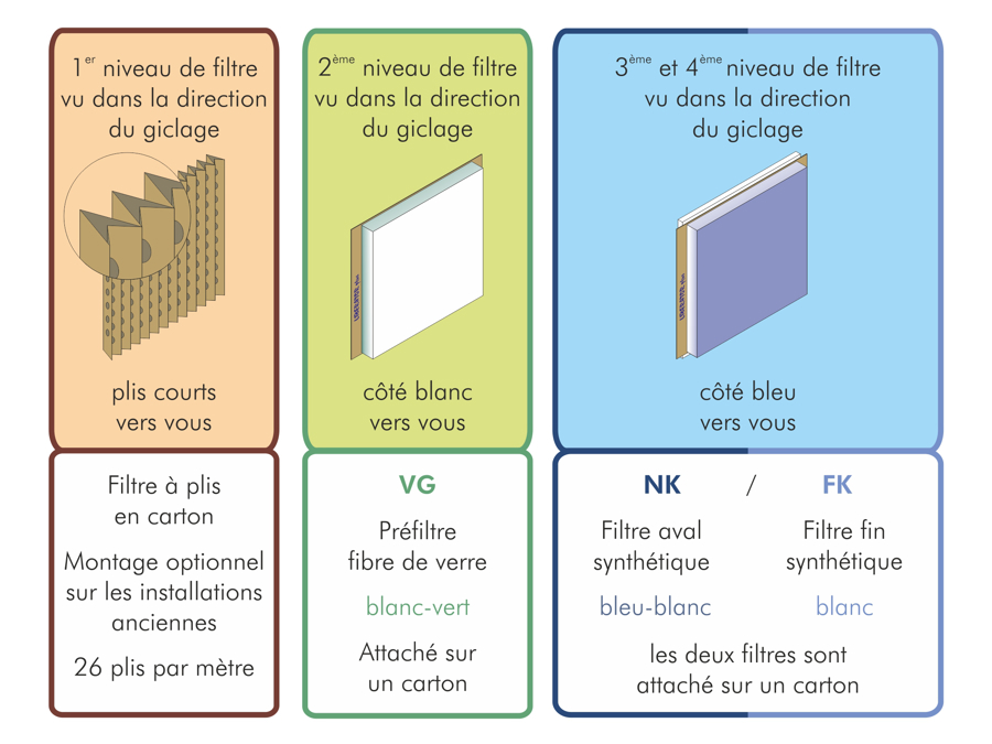 Afin d'obtenir une durée de vie maximale, seuls des médias filtrants de haute qualité sont utilisés. Le système de filtration à plusieurs niveaux permet en outre de remplacer individuellement les niveaux de filtration en fonction du degré de saturation.