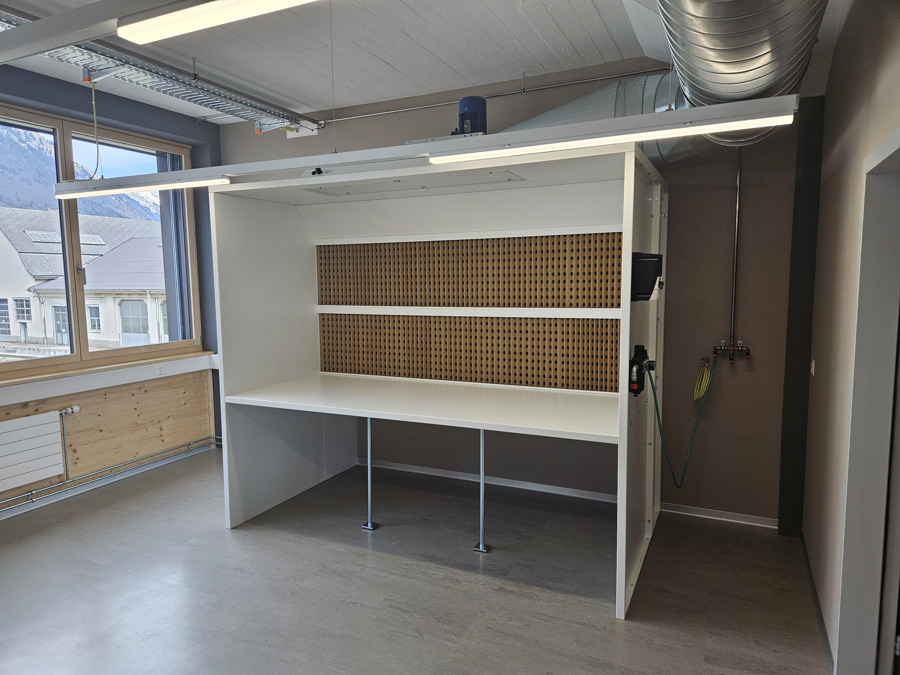 Die Tischkabinen können je nach Modell ohne Leistungsunterschiede mit 230V oder mit 3x400V betrieben werden. Das steckerfertige Modell mit integrierter Luftmengenregulierung ermöglicht die volle Flexibilität. Die speziell für Lackierkabinen konstruierte Beleuchtung mit Sicherheitsglas und LED-Modulen gehört ab Baugrösse 75 ebenfalls zum Standard.