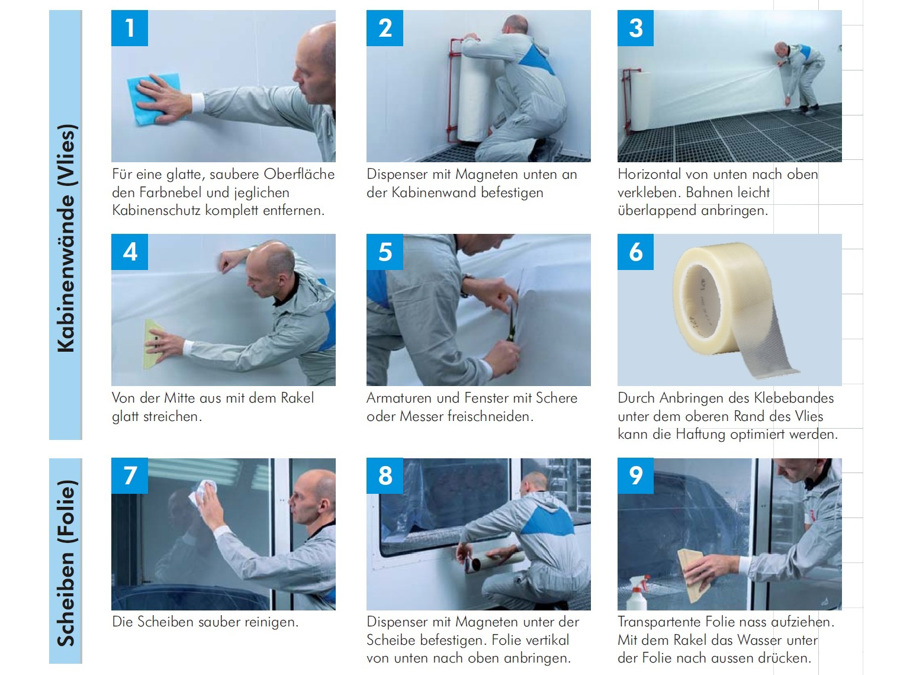 Schützen Sie mit dem Kabinenschutzvlies Wände und Böden in Lackierkabinen. Die speziell entwickelte Abdeckung schützt in Lackierkabinen vor Staub und Sprühnebel und verbessert die Lichtverhältnisse im Arbeitsbereich. Mitarbeiter profitieren von besseren Sichtverhältnissen und Ihre Werkstatt macht auf Kunden einen ansprechenderen Eindruck. Der Kabinenschutz besteht aus einem weißen Vliesmaterial mit selbsthaftender Unterlage und kann problemlos an Wänden und Böden angebracht werden. Schützt vor Schwebeteilchen und ermöglicht so eine sauberere Arbeitsumgebung.